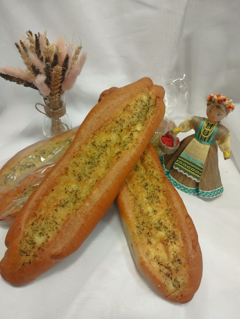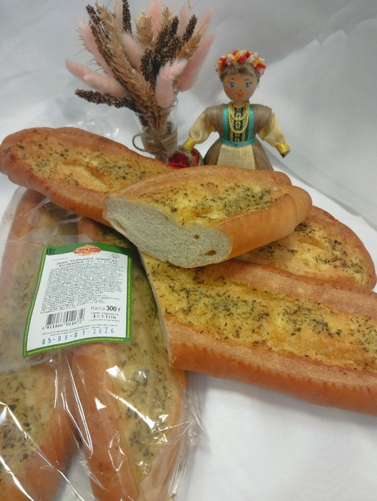 Багет «Геленовский пряный» представляет собой булочное изделие, вырабатываемое из смеси муки пшеничной высшего сорта, с добавлением сахара, масла подсолнечного рафинированного и другого сырья, с начинкой, состоящей из смеси чесночно-пряной. В упаковке — 2 багета, срок годности — 4 суток.