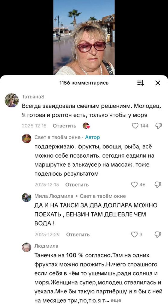 65-летняя пенсионерка из Минска нашла способ провести три зимних месяца на берегу Красного моря в египетском городе Хургада на свою белорусскую пенсию (около 300 долларов). Своим опытом женщина делится в TikTok, где у неё уже более 7 тысяч подписчиков. Её блог стал настоящей инструкцией для тех, кто мечтает о солнце и море, но опасается финансовых затрат, пишет mlyn.by.