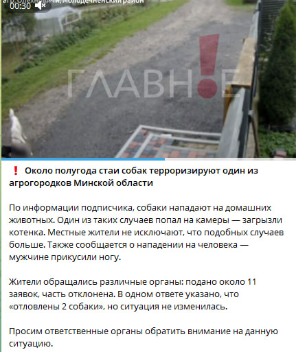 Две бродячие собаки в Олехновичах, согласно видео от местной жительницы, напали на котёнка и держат в страхе жителей агрогородка. В подписи к видео в Телеграм также сообщается о нападении на человека — мужчине прикусили ногу.
