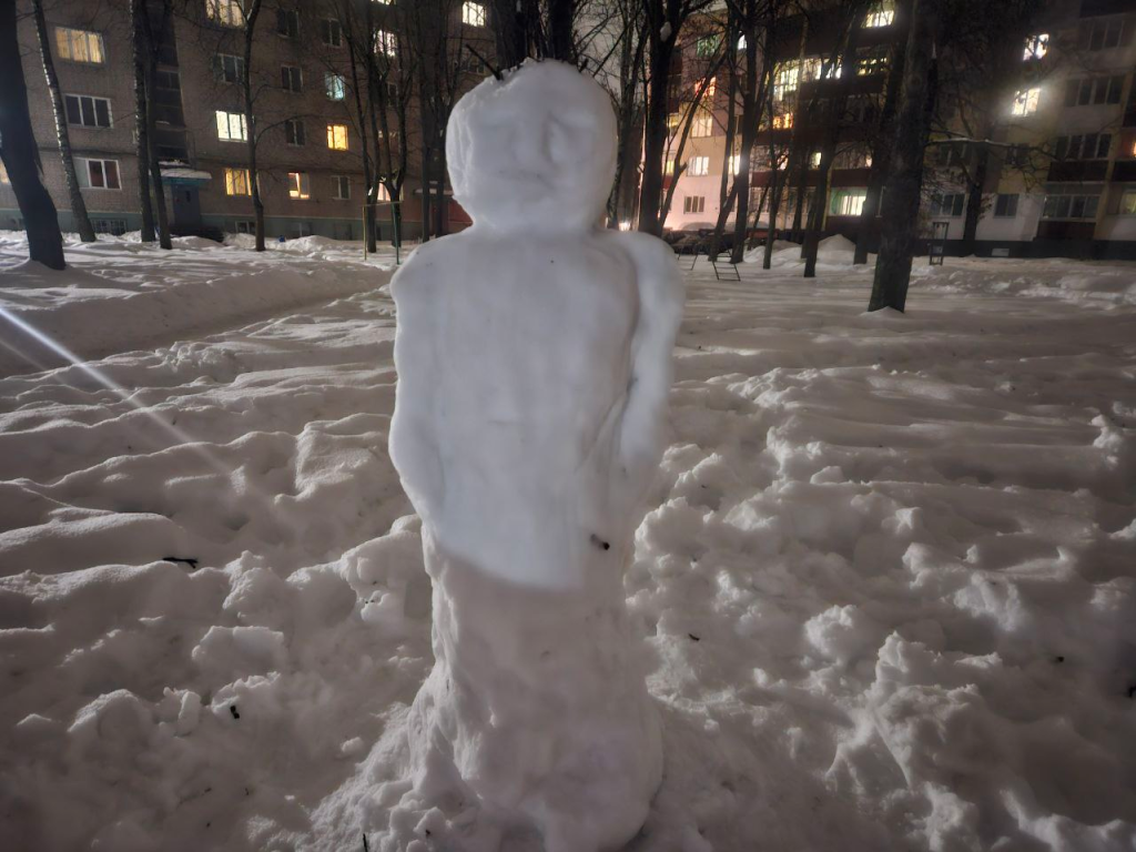 Жители Молодечно слепили из снега грустного горожанина и безбилетного пассажира