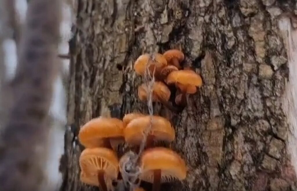 В пятиминутном видео мужчина шаг за шагом идёт по лесу по колено в снегу, осторожно обходя снежные сугробы и ветки. И вот чудо: даже среди зимнего пейзажа на деревьях и валежнике начинают пробиваться грибы.