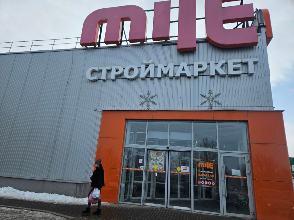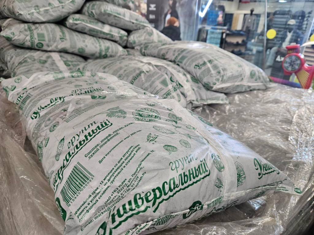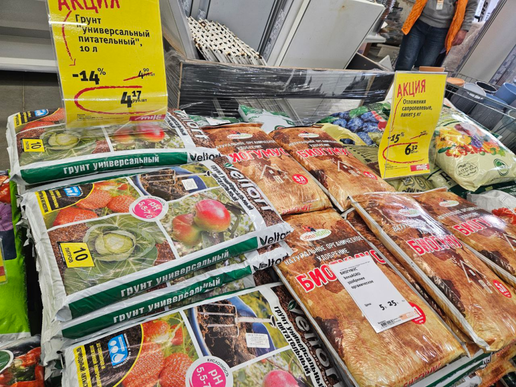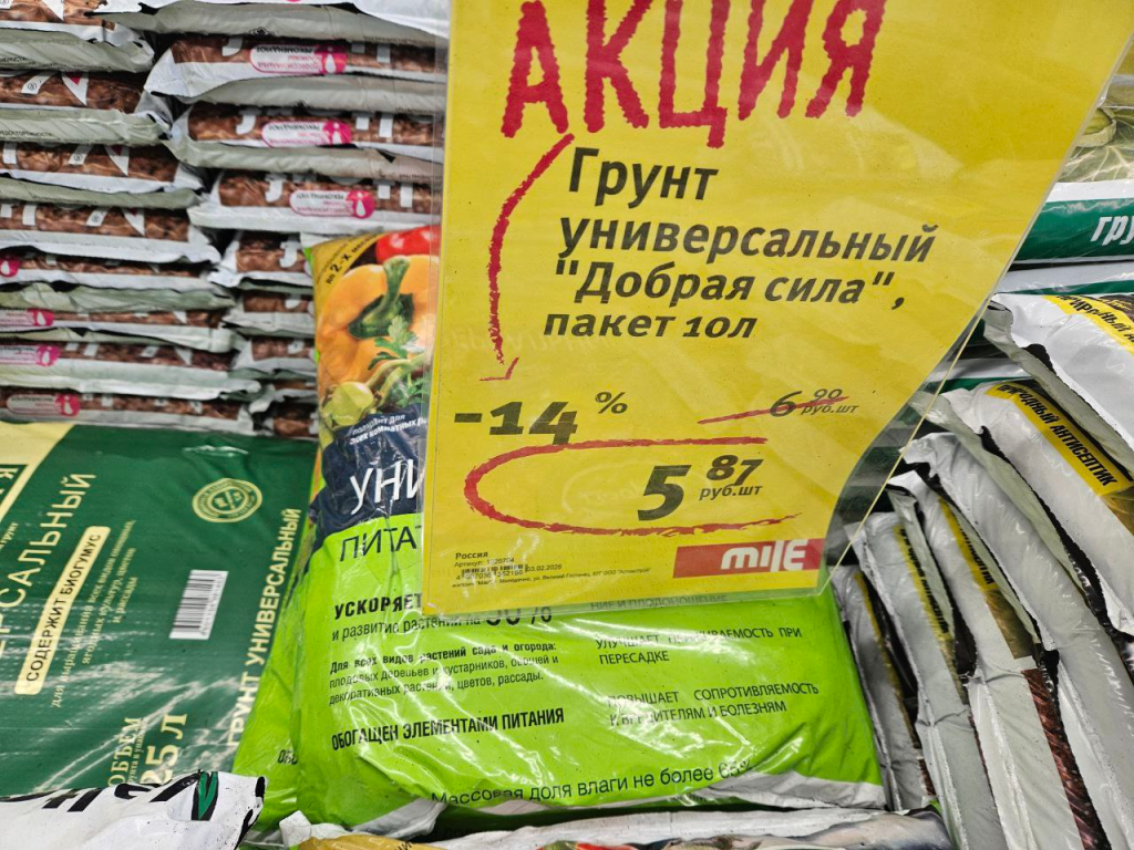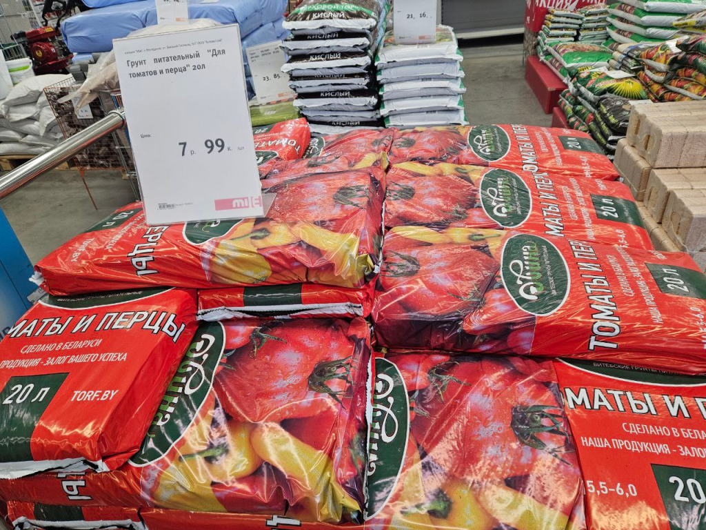 Строймаркет Mile к сезону готов. Торговая зона с грунтом расположена сразу на входе. Мешки питательной земли по 20 литров предназначены для выращивания томатов и перцев и стоят по 7 рублей 99 копеек.