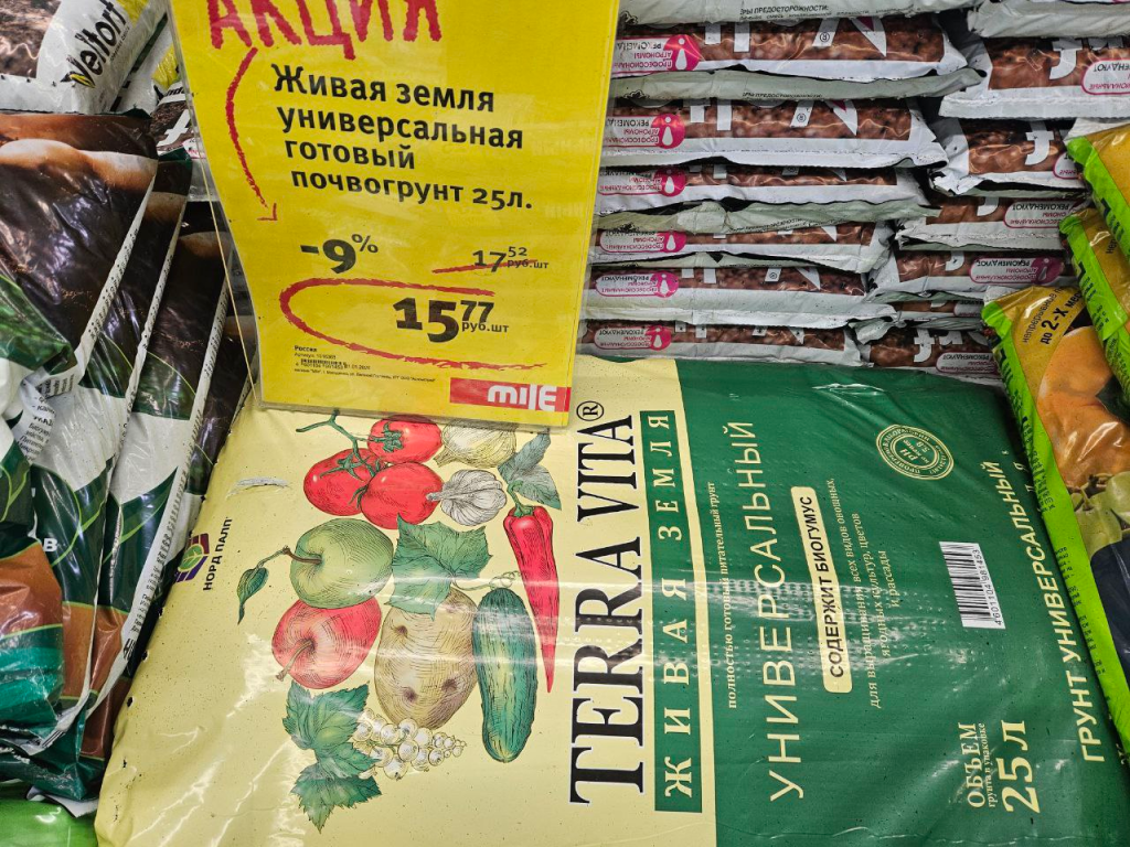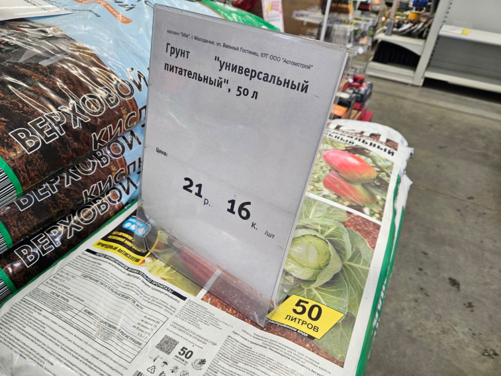 Немного дальше — универсальный питательный грунт объёмом 50 литров по 21 рублю 16 копеек.