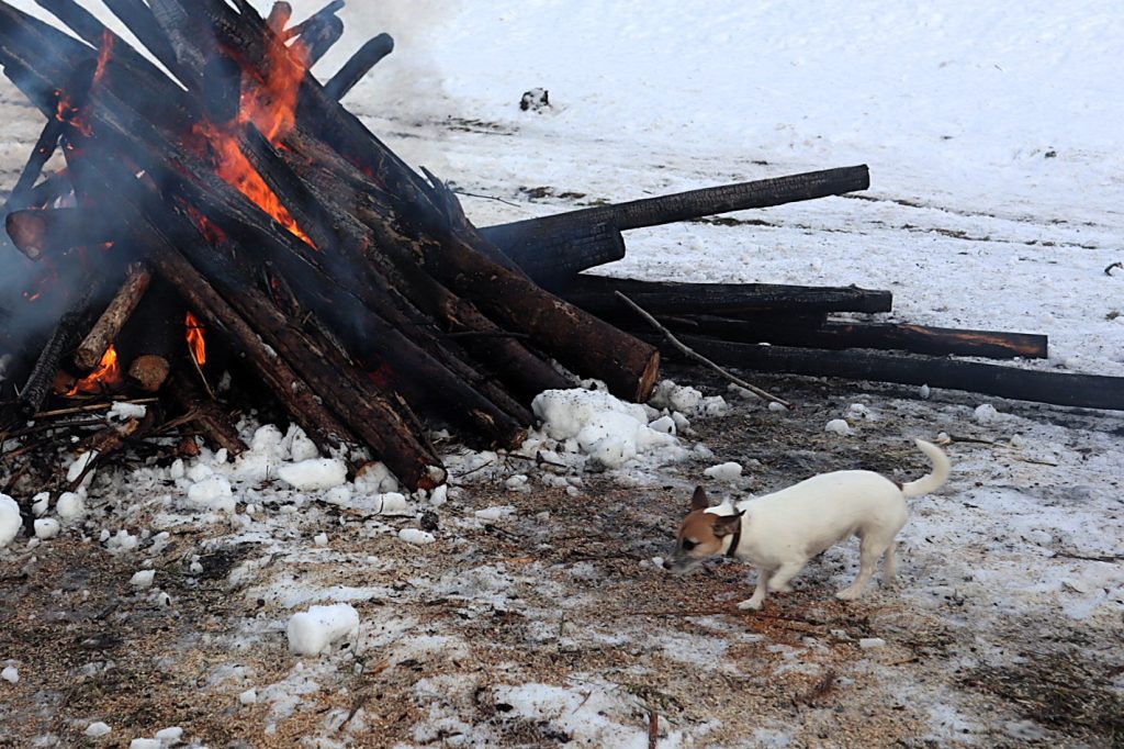 15:55. Искренний интерес с догорающему чучелу проявляет собачка Кора, которую постоянно одергивает от костра девушка-хозяйка.