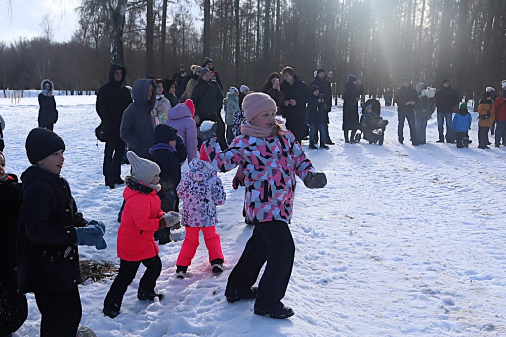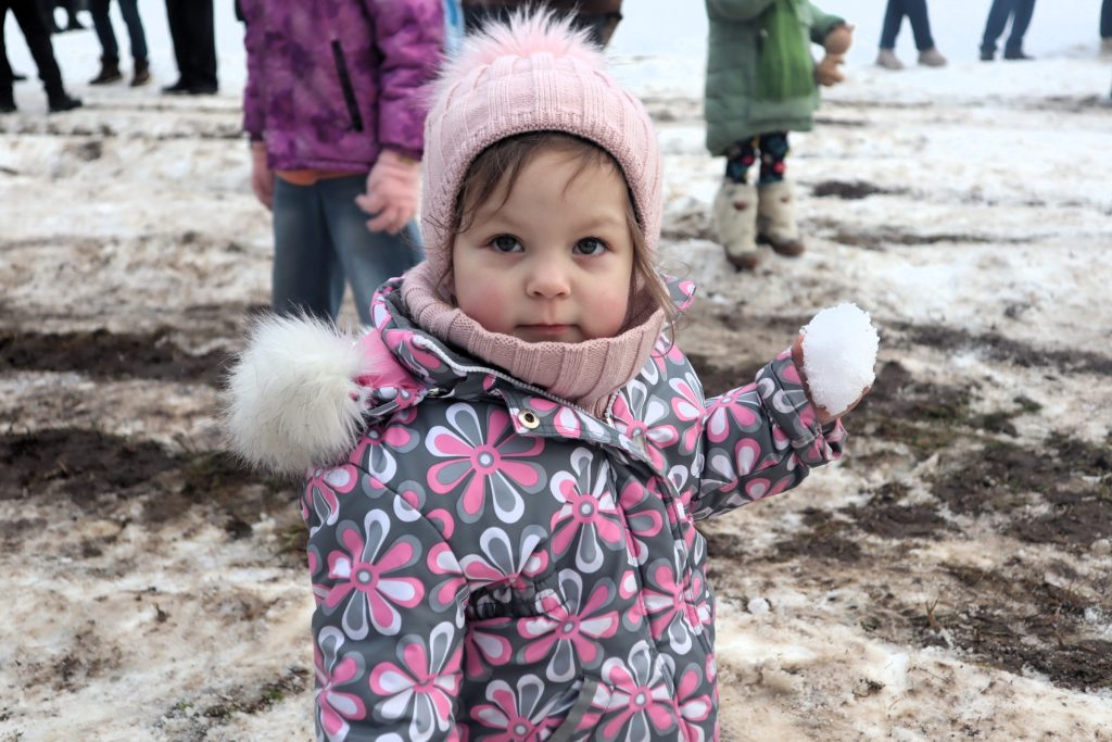 Детвора от всей души развлекается. Причем взрослые с не меньшим азартом помогают своим чадам мешать Масленице гореть. Безусловный собственный весомый вклад в доставку снежков к огню вносит Василиса.