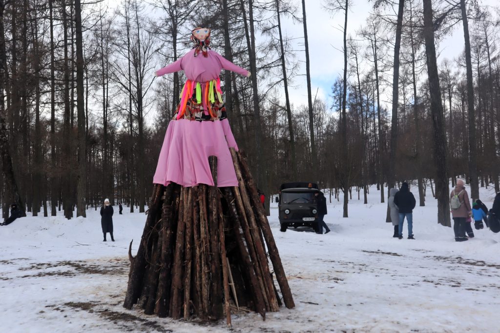 Начнем с того, что брёвна для фигуры мистической девушки предоставил «Коммунальник», а платьице и голова Масленицы с голубыми глазами – это продукт творчества креативных работников Дворца культуры.