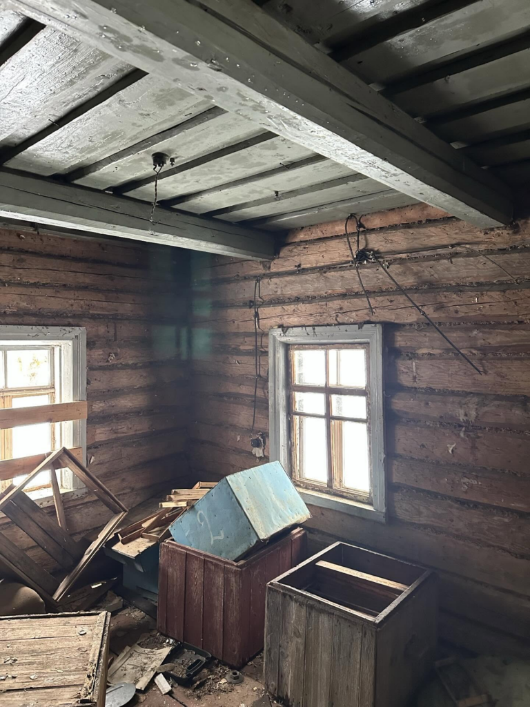 На участке расположены три дома с оформленными документами, все они находятся в частной собственности. Один из домов — бревенчатый, одноэтажный, общей площадью 43,3 квадратных метра. Это традиционный деревенский дом с печным отоплением и шиферной крышей. В доме проведено электричество, а воду можно брать из колодца, расположенного на участке.