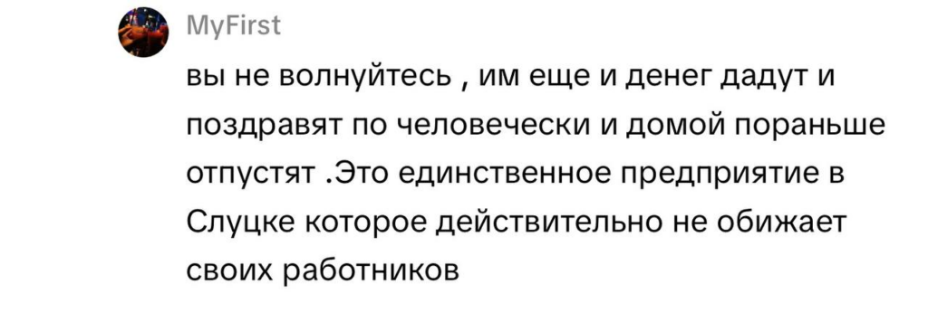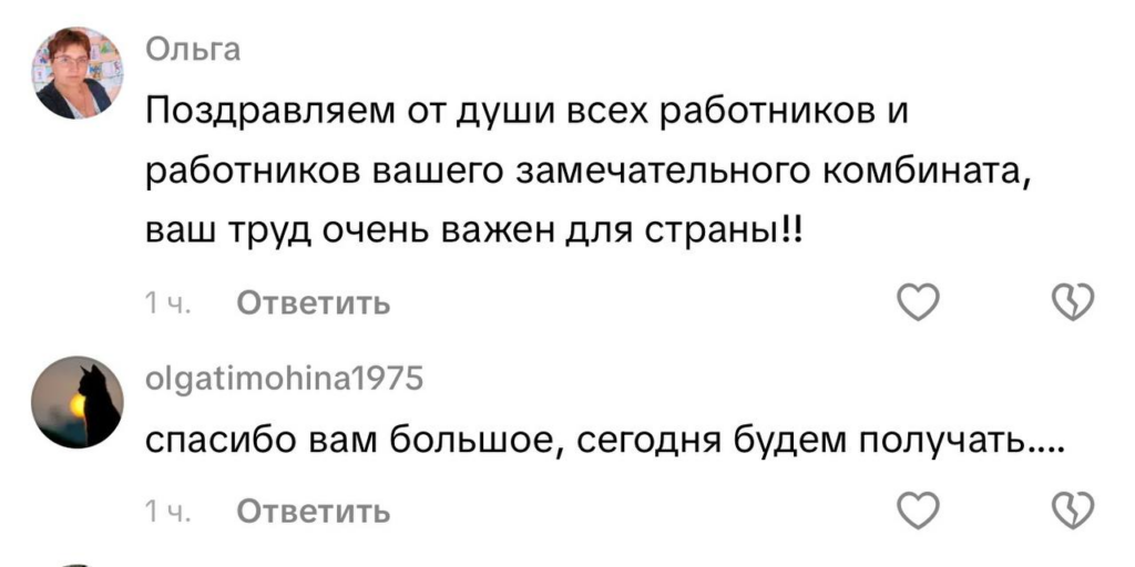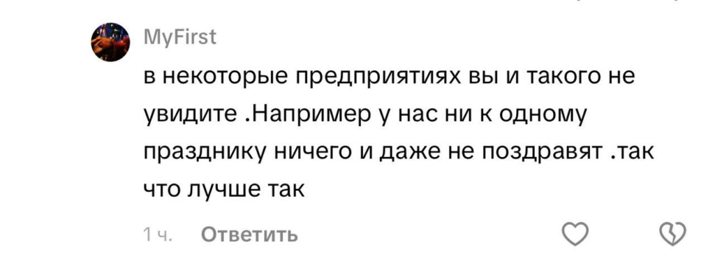 В комментариях пишут, что на других предприятиях такого отношения нет: ни поздравлений, ни подарков, ни какого-то внимания к праздникам. Поэтому, как отмечают люди, даже небольшие бонусы и простое человеческое отношение уже воспринимаются с теплом.