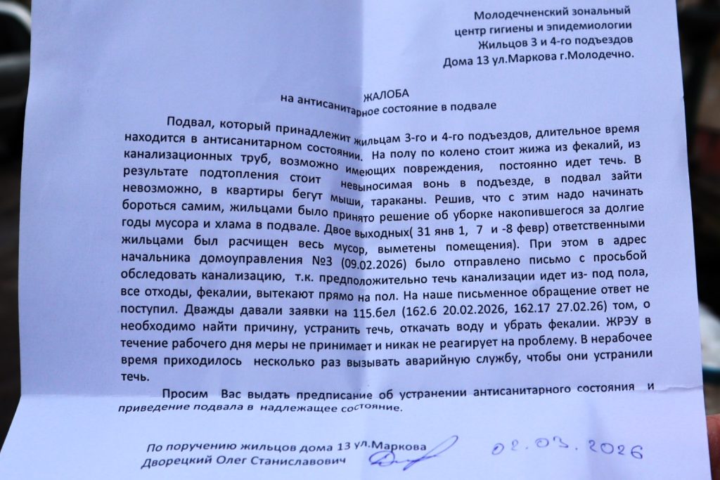 В Молодечно на улице Маркова в пятиэтажке №13 с четверга, 26 февраля, затоплен подвал между третьим и четвертым подъездами. Однако жильцы жалуются не только на это. Рассказываем, что ещё им не нравится.