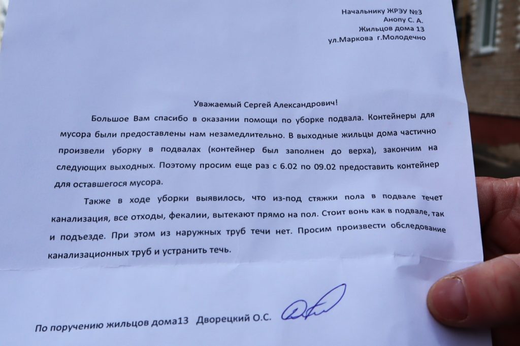 – Мы написали письмо в домоуправление, в котором поблагодарили начальника ЖРЭУ за предоставленные контейнеры и попросили обследовать канализационные трубы и устранить течь, – рассказывает Олег.