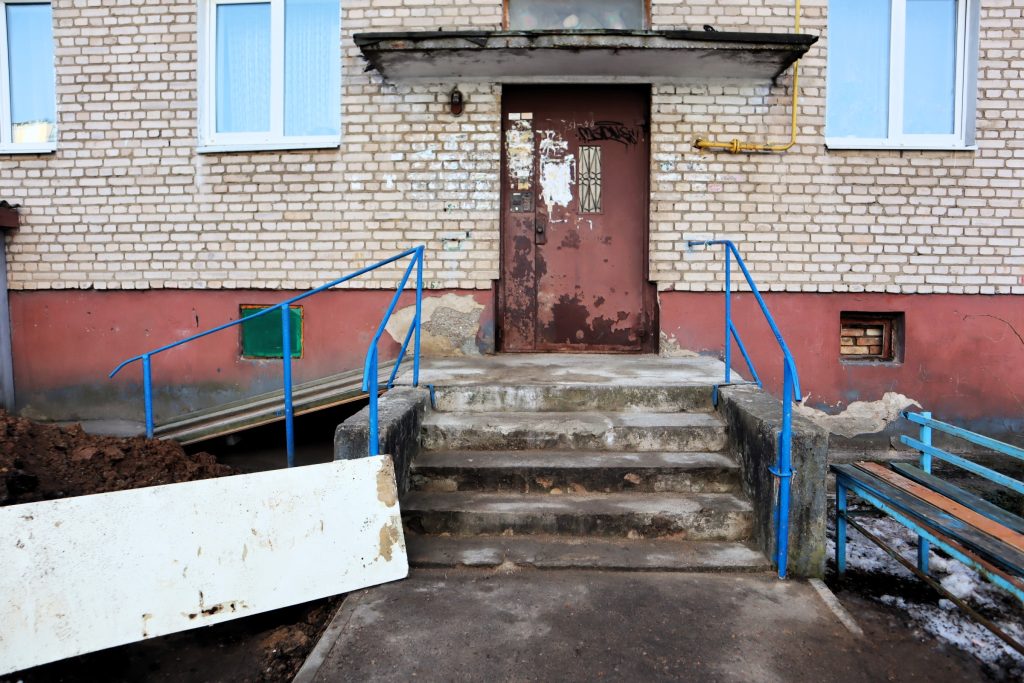 Для ремонта канализации необходимо раскапывать территорию возле крыльца четвёртого подъезда. Здесь в одной из квартир живет человек с проблемами опорно-двигательного аппарата. Для него установлен деревянный пандус к крыльцу.