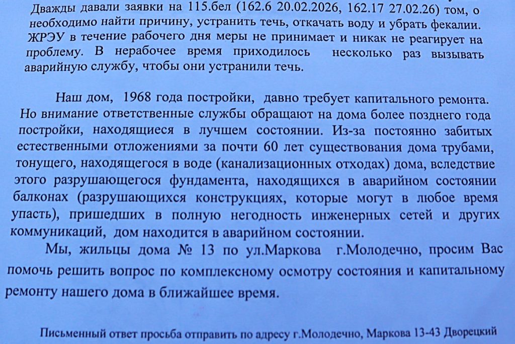 Олег рассказал, что 4 марта жильцы отнесли в райисполком письмо с просьбой рассмотреть возможность капитального ремонта их дома.