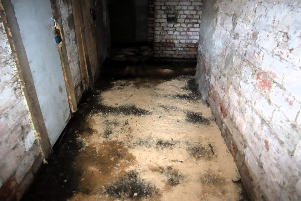 Журналист спустился внутрь, чтобы посмотреть, что там происходит через два дня после визита санстанции. В одной части подвала вода действительно остаётся на земле. Пройти, не замочив ноги, можно только если аккуратно ступать по выложенным кирпичам и доскам.