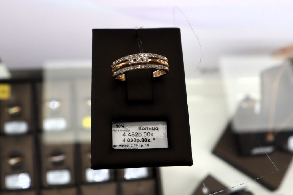 Самые дорогие кольца, конечно же, с бриллиантами. Вот, например, один из лидеров по стоимости – золотое кольцо с бриллиантами. Цена – 4 482 рубля. Минус – скидка в 10 процентов. Сумма к оплате – 4 033 рубля 80 копеек.