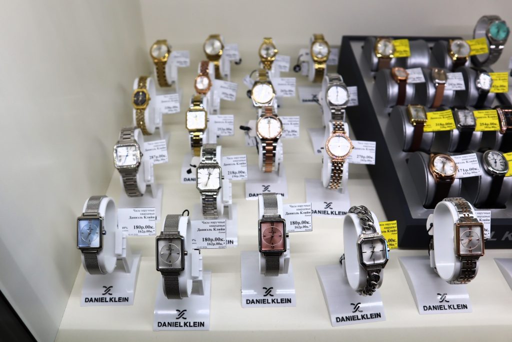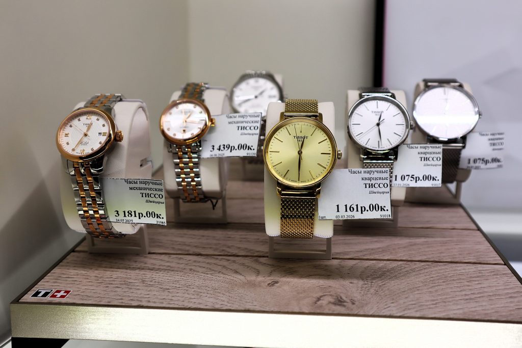 Насколько непростая задача стояла в этот день перед Екатериной и её мужем Константином, можно понять, взглянув на витрину этого же магазина с мужскими швейцарскими часами TISSOT. Цены на них начинаются от 1 161 рубля.