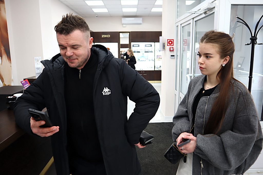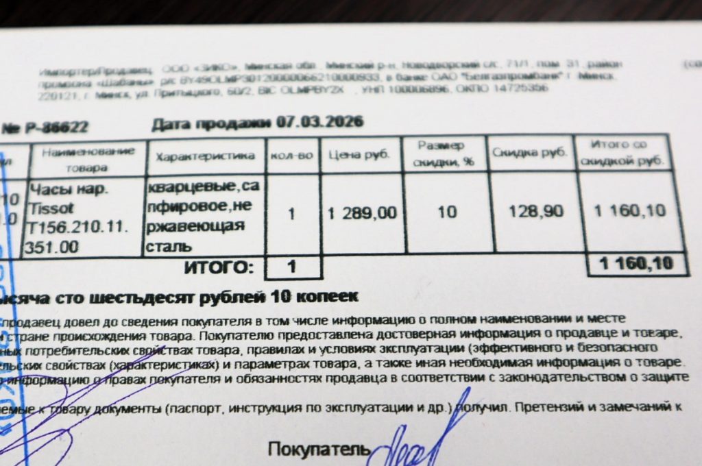– Мужчины прям выстроились в очередь, а своих женщин усадили на диванчик. Перед 8 Марта женщинам нельзя стоять в очереди, – уверена Софья. У неё в руках множество чеков, подтверждающих сегодняшние покупки. По просьбе журналиста Софья выбирает самый дорогой на этот момент чек, который выписан при покупке всё тех же швейцарских часов TISSOT стоимостью 1 160 рублей 10 копеек с 10-процентной скидкой.