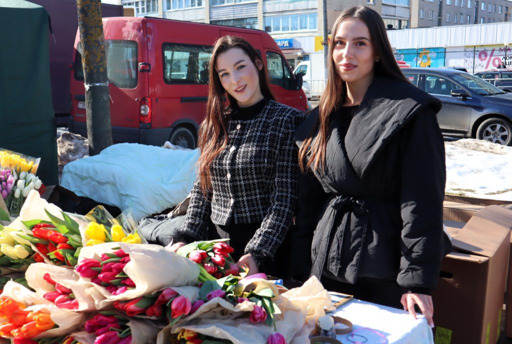 Рита и Маша в свой законный девчачий праздник работали не покладая рук. Девушки удовлетворяли острую народную потребность в тюльпанах и мимозах.