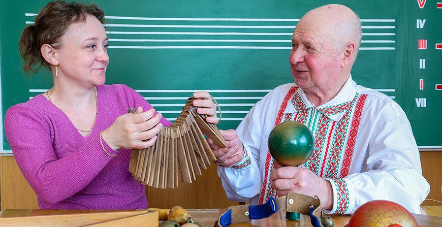 Валентин Жагуло показывает изготовленные им инструменты, которые есть в школе. Трещотки из яблони, дерева жесткого, с ярким ароматом. Бубенцы на деревянной «рогатке» и тканевом «поясе» — для народной песни, в которой поется о запряженной конями повозке.