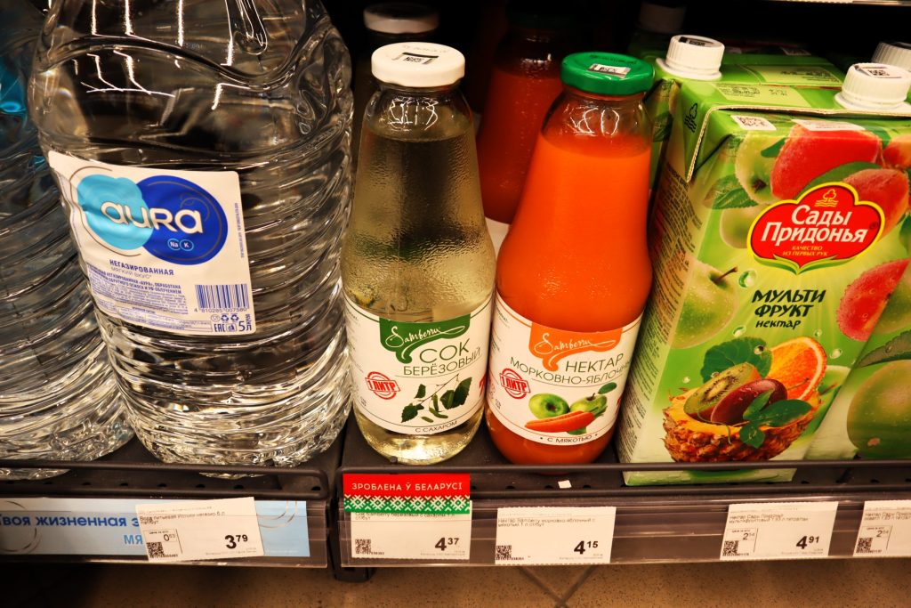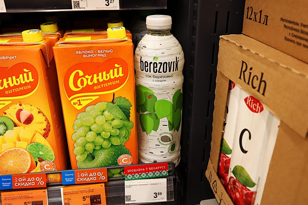 Сравним с ценами в магазинах. В одном из супермаркетов на улице Франтишка Скорины в Молодечно продаётся берёзовый сок с сахаром двух производителей. В стеклянной бутылке литр стоит 4 рубля 37 копеек.