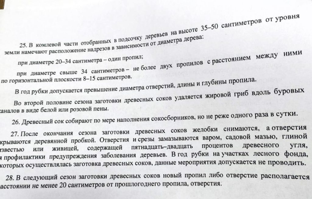По словам Ирины Колошич, существует установленный порядок процесса сбора берёзового сока. Например, его разрешено собирать только с деревьев, диаметр которых составляет 20 сантиметров и более.