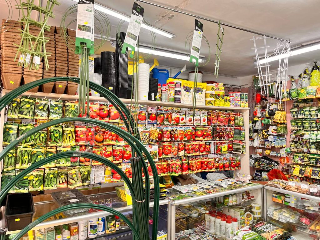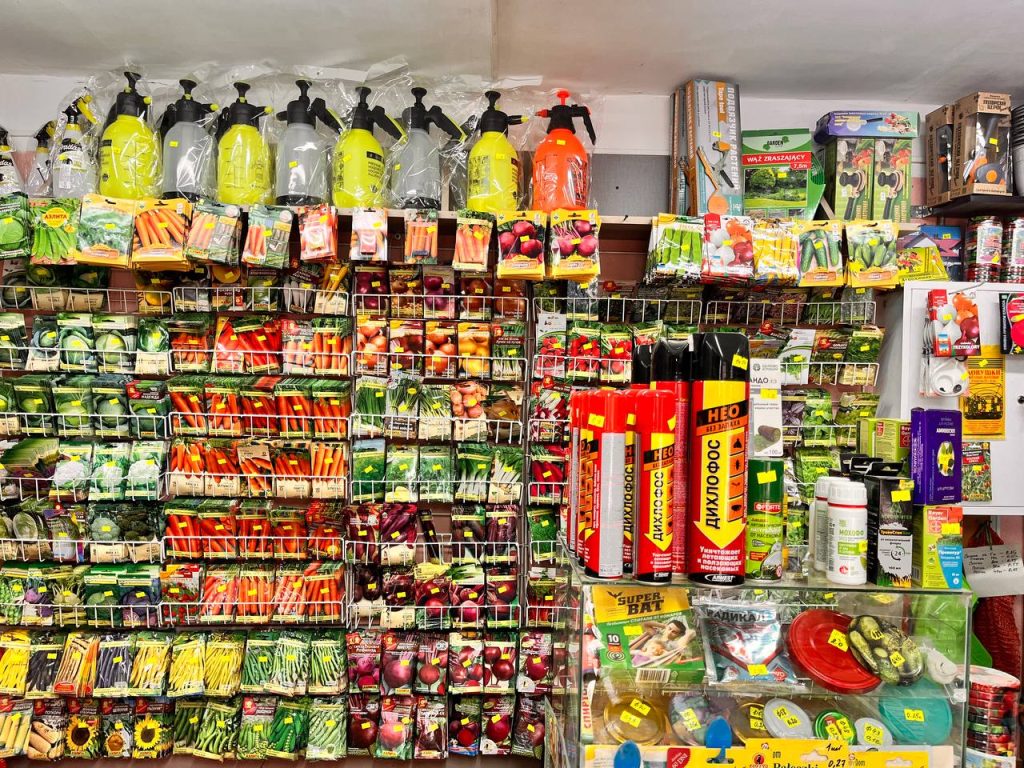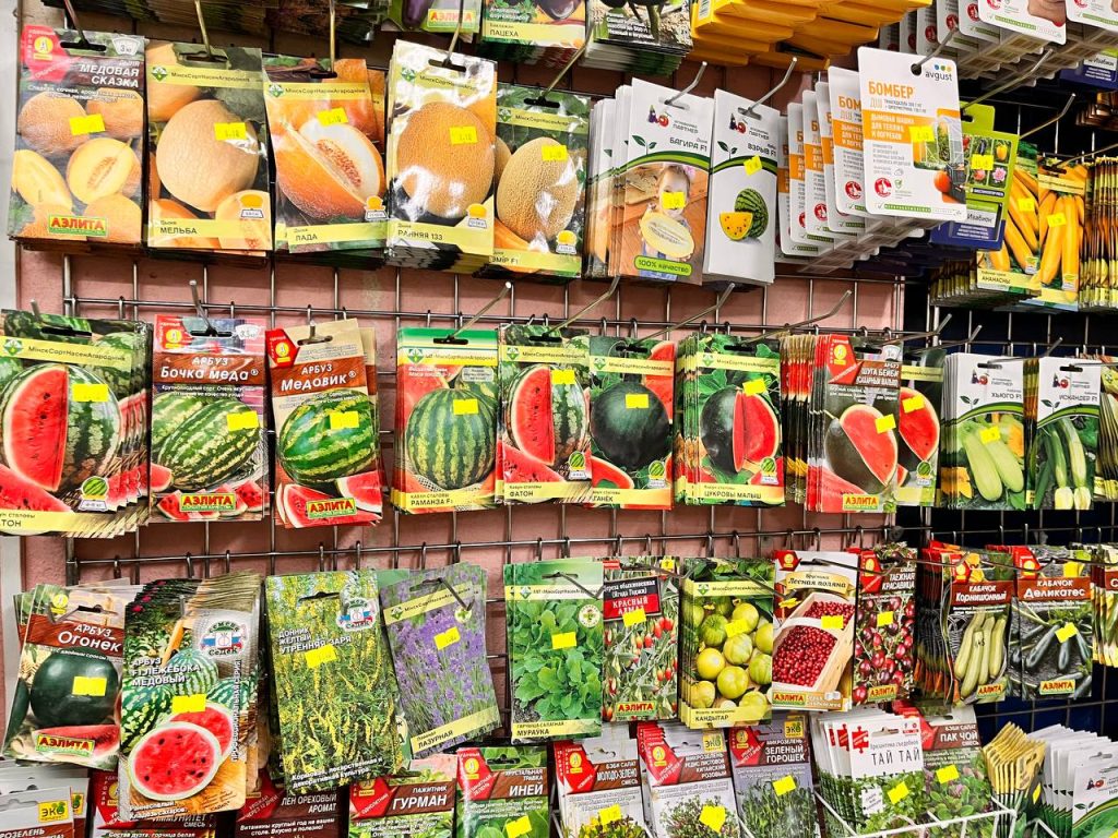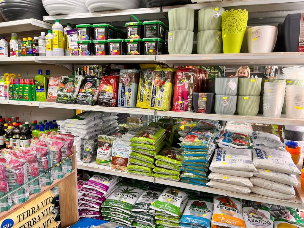 Здесь есть всё: от семян до грунта, подкормки и удобрений, от цветочных горшков до закаточной машинки, секаторов, граблей, лопат и веников.