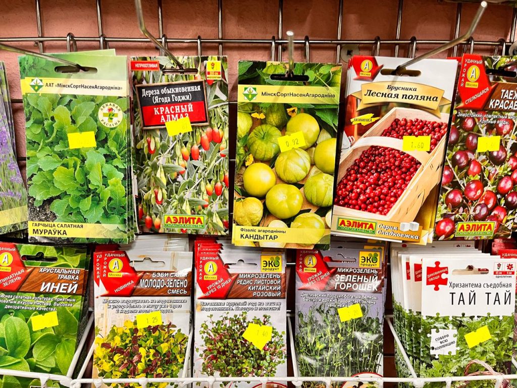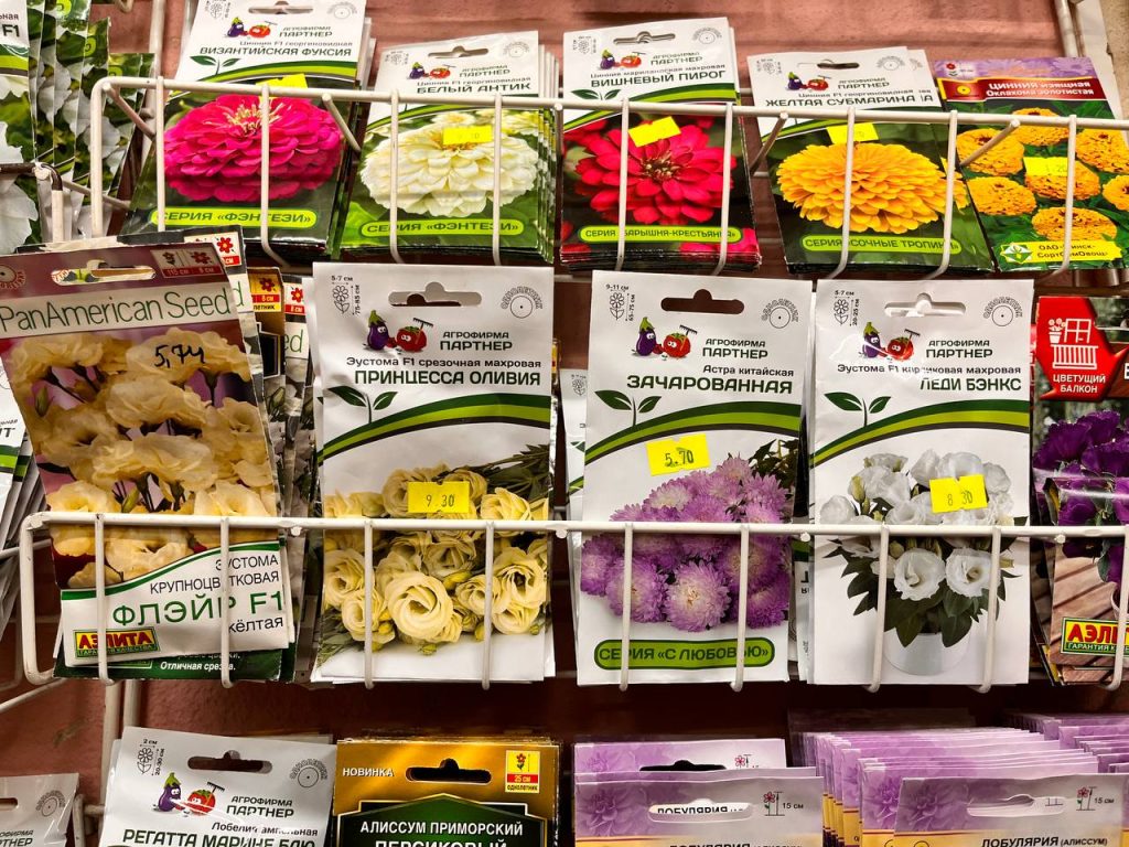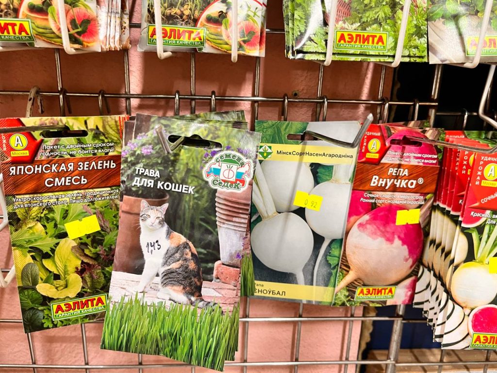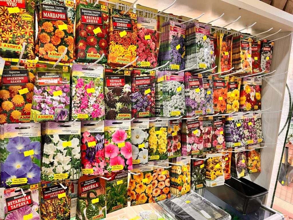 Нина Алексеевна говорит, что сейчас разбирают практически все семена: помидоры, огурцы, редиску, салаты, морковку, кабачки. Спрос идёт ровно по тому, что обычно сажают на участках.