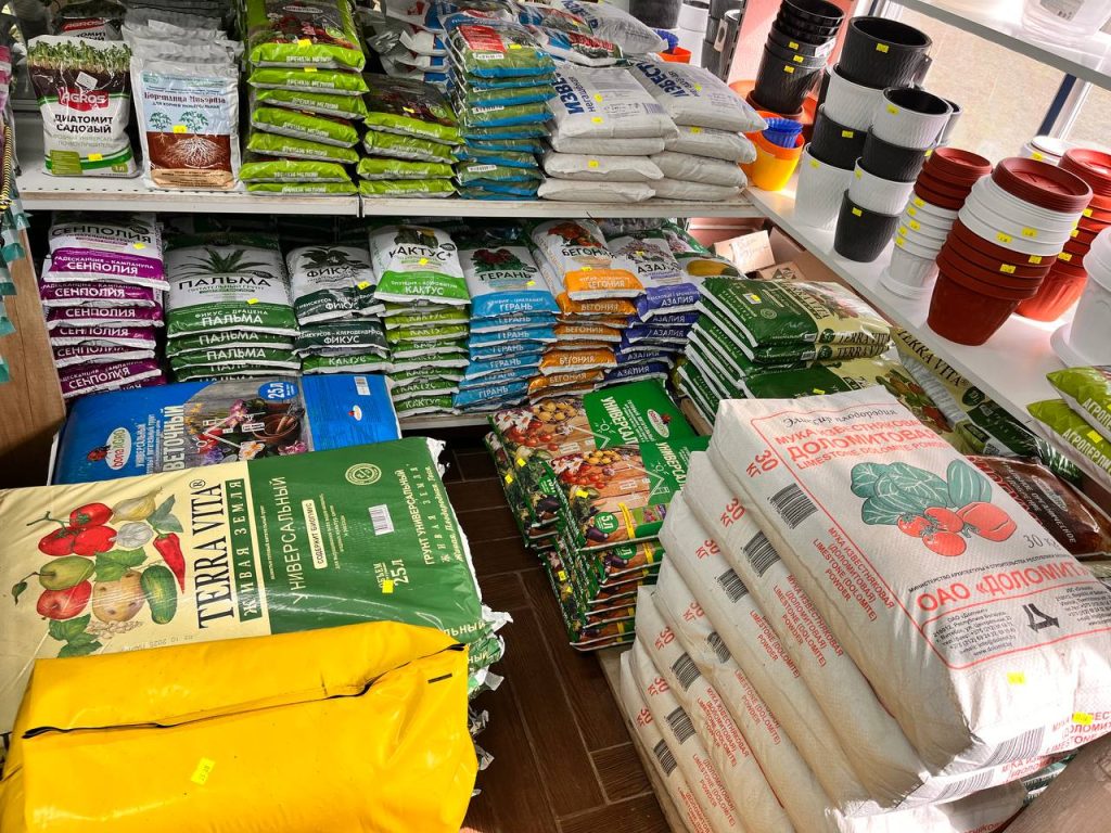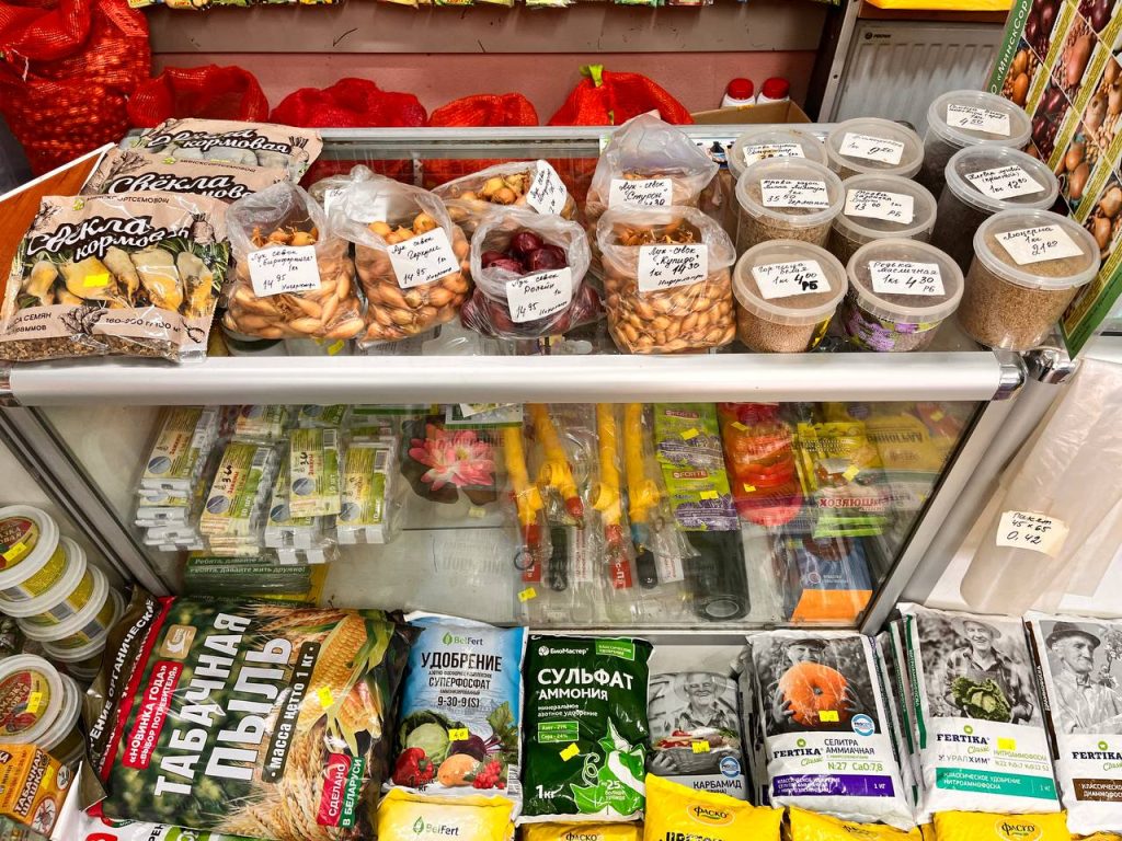 Ассортимент в магазине не ограничивается ассортиментом семян. Здесь же покупают удобрения — для картофеля, винограда, клубники, лука, чеснока. Есть средства для обработки растений, секаторы, лейки, горшки.