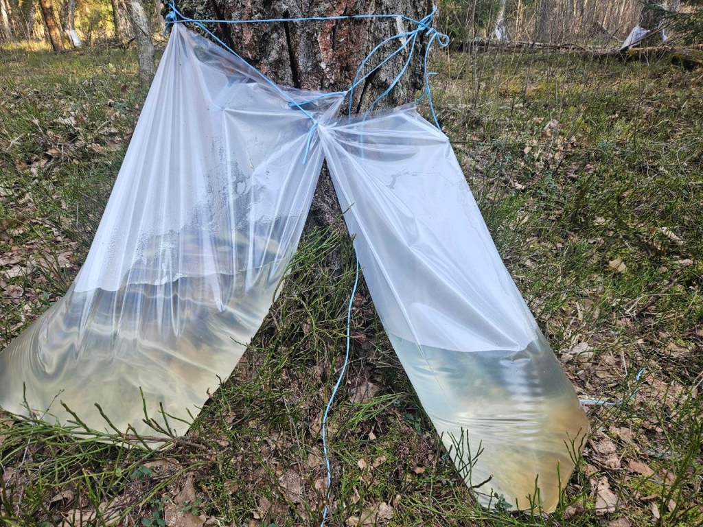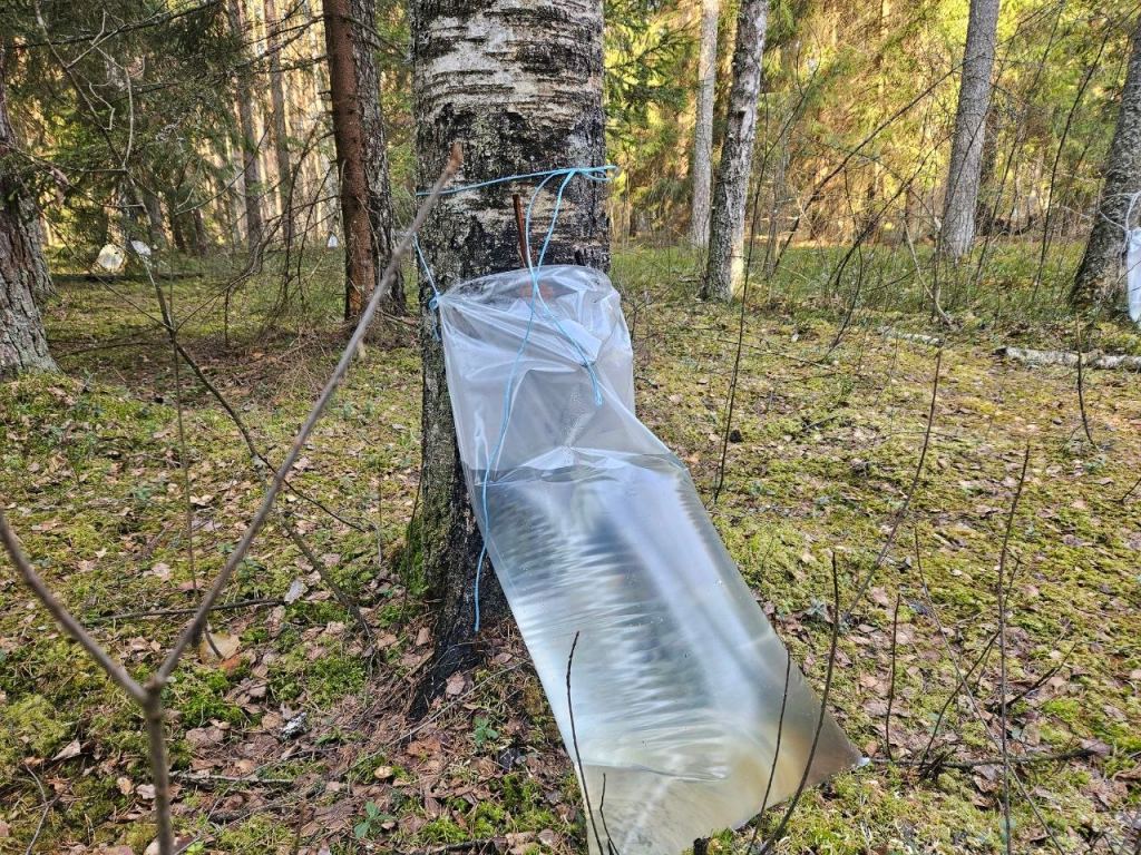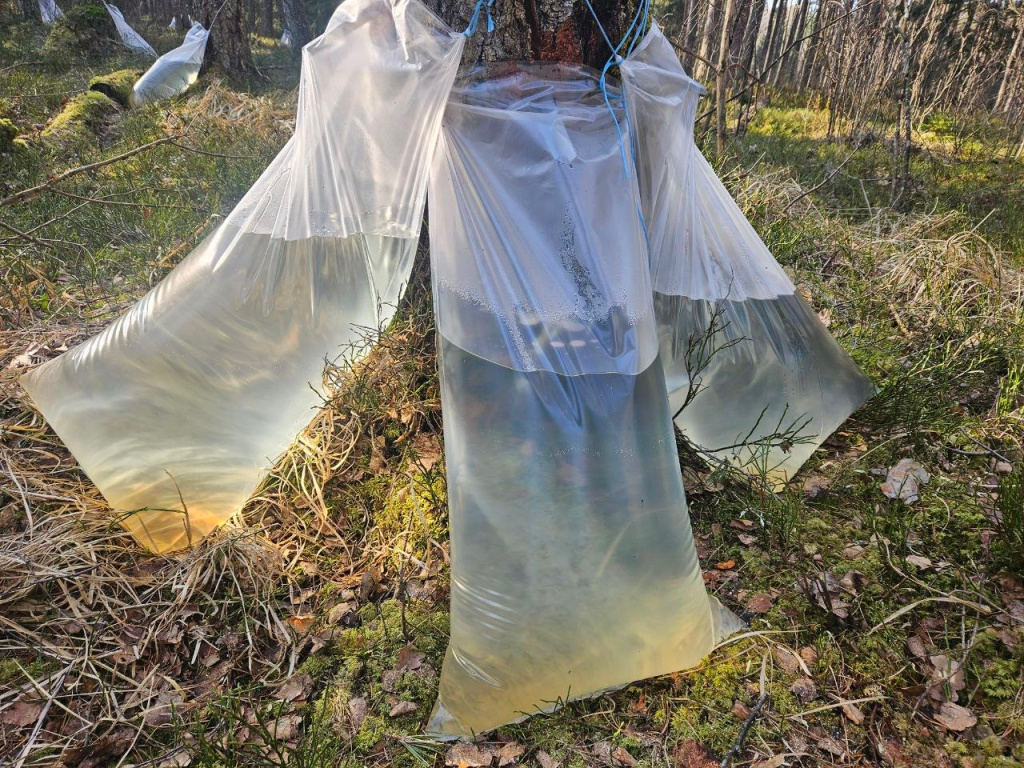Собирают сок на участке леса, расположенного вдали от дорог. Например, в момент встречи с журналистом расстояние до Молодечно составляло14 километров.