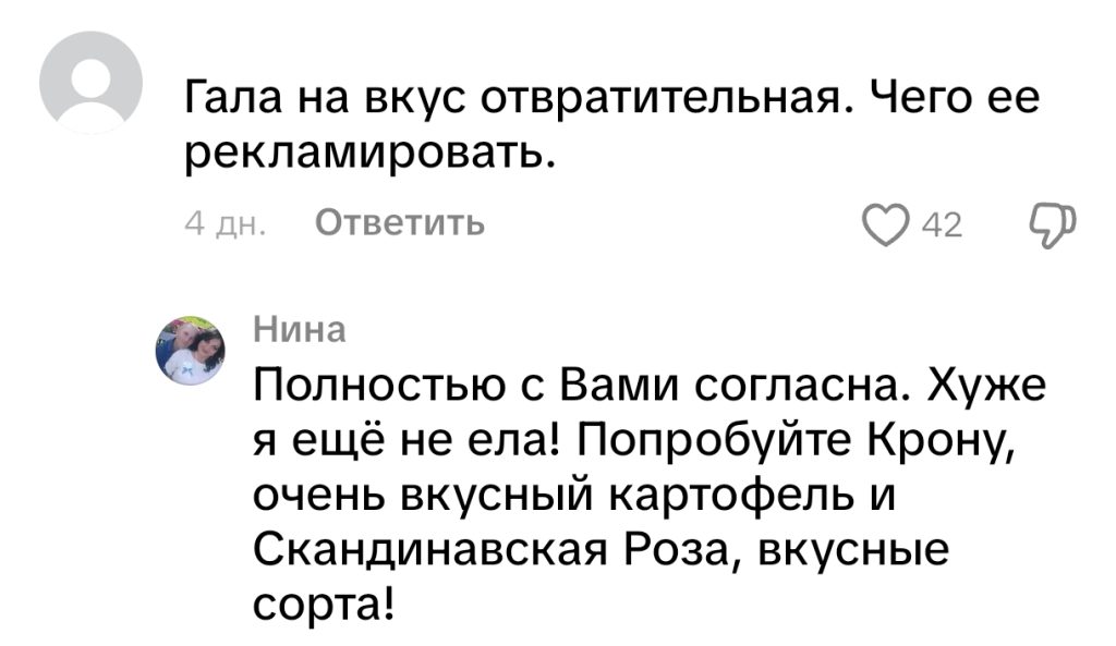 Некоторые зрители не согласились с рекламой сорта Гала и предложили попробовать другой картофель. Другие же пошли в защиту и отметили, что Гала — картошка очень вкусная.