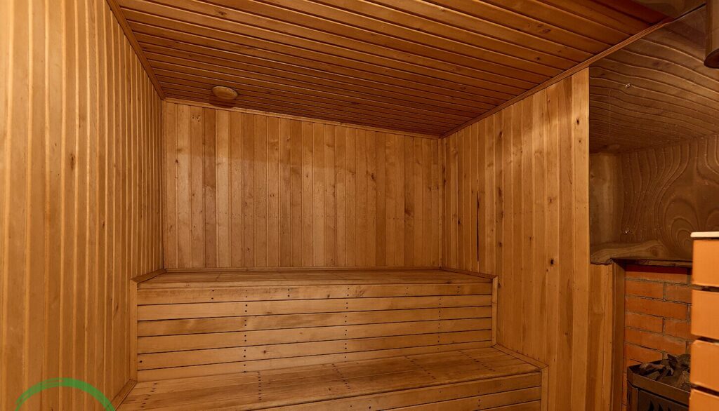 На участке площадью 15,6 соток расположена баня, выполненная также из бруса, площадью 29 квадратных метров. Внутри бани имеется парилка, а также душевая и стиральная машина. К тому же, здесь установлен бойлер для обеспечения горячей воды. Рядом с баней находится каркасный бассейн.