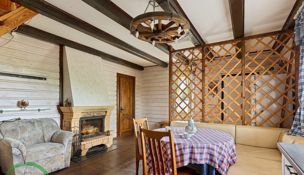 Первый этаж дома включает в себя просторную гостиную, где установлен камин, создающий уютную атмосферу, и большую кухню, оборудованную всей необходимой техникой, включая посудомоечную машину и бойлер. Это идеальное место для семейных встреч и дружеских посиделок.