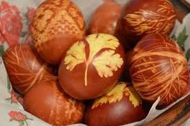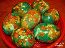 Это классический способ, который часто использовался нашими бабушками. Нарезаете мелко луковую шелуху и белую бумагу, смешиваете. Смачиваете сырое яйцо водой и обваливаете в смеси. Потом кладёте яйцо на марлю и завязываете ниткой.