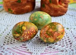 Заварите крепкий настой каркадэ, а на пищевую плёнку выложите листья (петрушки, укропа, одуванчиков). Сверху кладёте яйцо и заворачиваете всё в пучок. Оставляете на 30–60 минут, а потом аккуратно разворачиваете. Когда снимаете плёнку — на яйце появляются узоры, похожие на мрамор.