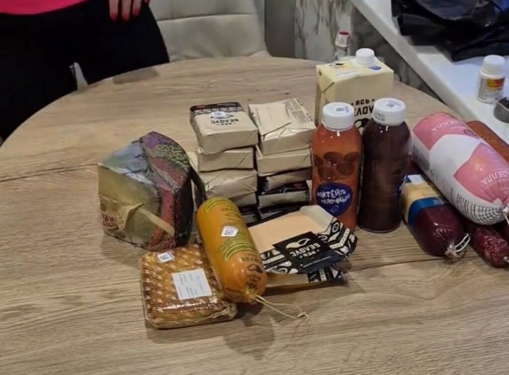 Содержимое набора выглядит внушительно: в него вошли 5 видов колбасы, более 10 пачек сливочного масла, включая шоколадное, несколько видов сыра — как в упаковках, так и в виде классического треугольника твердого сыра, а также сыр в колбасном формате.