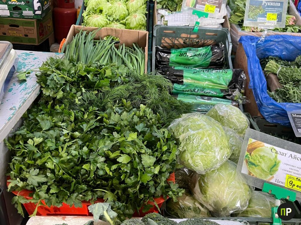 Свежей зелени сейчас много: укроп и петрушка (пучок 500 грамм — в районе 5 рублей), руккола (есть весовая — 5 рублей за 100 грамм и упаковка за 6 рублей), кинза (пучок 200 грамм обойдётся в 9 рублей). Салат листовой — 2,50 рубля за 100 грамм. Лук длинный зелёный — 2 рубля за 100 грамм.