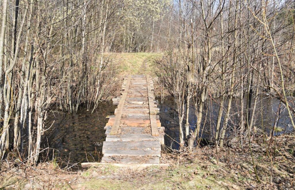 Показал собеседник подходы к берегу в других местах – дальше от центра агрогородка. В одном – люди сколотили крепкий на вид мостик, в другом – трухлявое бревно лежит, так что пробраться дальше сложно.