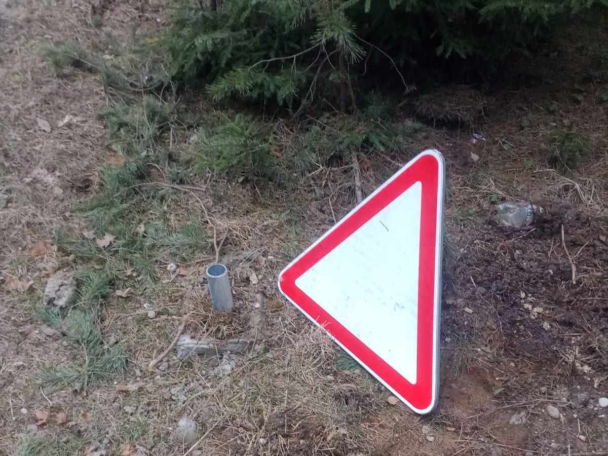 Сотрудники организации находят дорожные знаки, у которых обрезаны металлические стойки, на обочинах и в кустарниках.