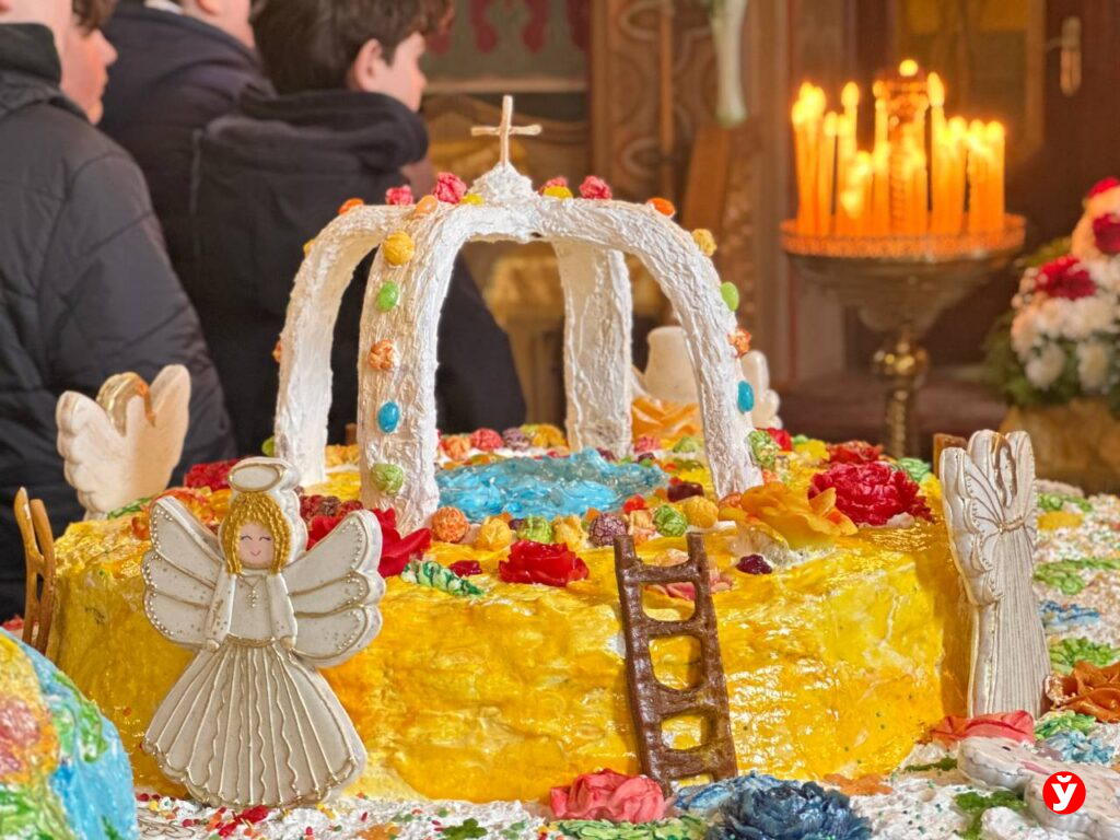 Декор пирога имеет духовный смысл, и он каждый год разный. В этом — на нем был изображен сюжет со множеством элементов и фигурок.