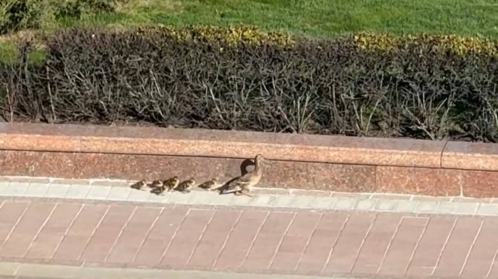 В конце видео мама-утка с утятами благополучно продолжила движение по тротуару. Остаётся догадываться, как они оказались на интенсивном участке дорожного движения в столице?