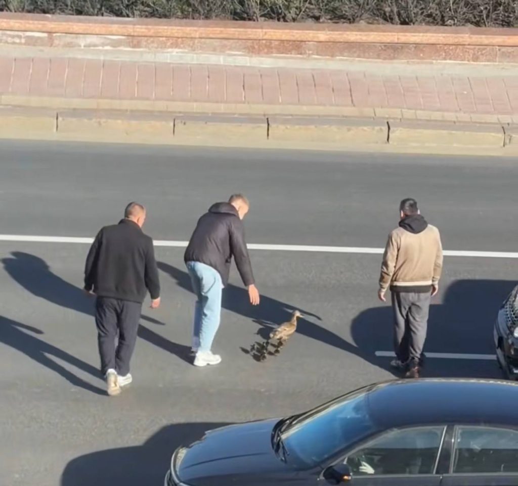 Как сообщается в описании под видео, утром, 22 апреля, водители остановились во время движения, чтобы помочь птицам благополучно преодолеть в целости и сохранности опасный участок дороги.